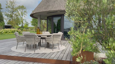 De Montera dining chair ademt luxe en klasse dankzij het elegante rope-design en het stevige aluminium frame. De combinatie van de mooi geweven zitting en de zachte bouclé outdoor kussens zorgt voor een rijk, comfortabel zitgevoel. De meegeleverde kussens maken de stoel extra uitnodigend, ideaal voor lange diners of ontspannen momenten buiten. Dankzij de all-weather stof blijven de kussens mooi en goed bestand tegen verschillende weersomstandigheden. Een stijlvolle en kwalitatieve eetstoel die perfect aansluit bij de rest van de Montera collectie.