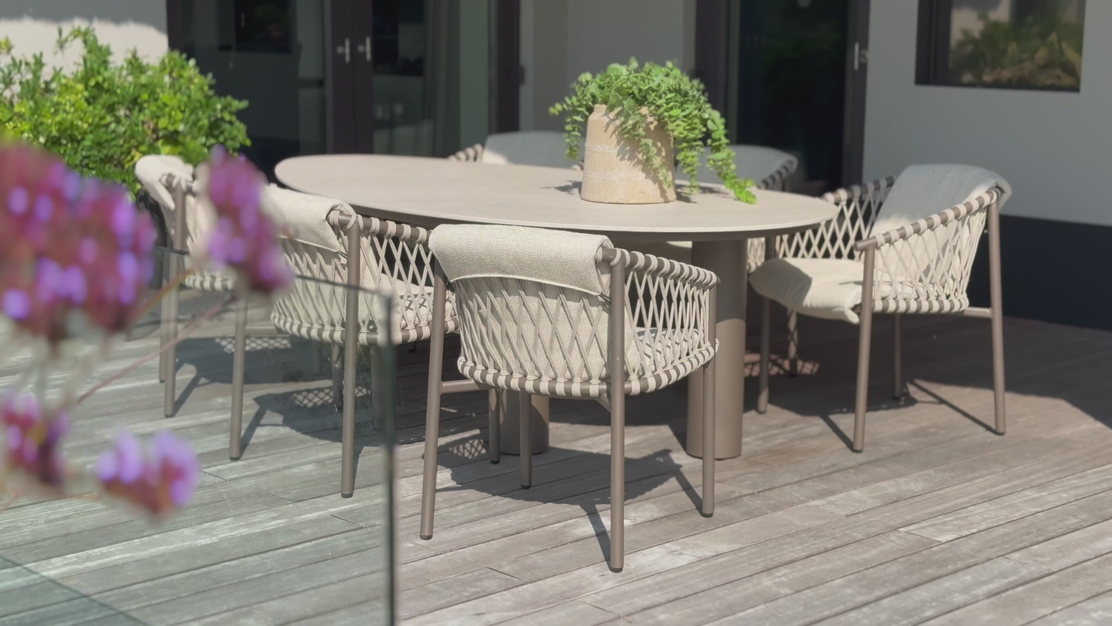 Tuinset Allora Terre brengt verfijnde elegantie naar je terras. Het slanke frame, het subtiele rope-patroon en de ronde vormen zorgen voor een zachte, moderne uitstraling die moeiteloos in iedere tuin past. De terre-tint geeft de set een warme, stijlvolle basis die heerlijk combineert met teak of aluminium. De comfortabele kussens nodigen uit om net wat langer te blijven tafelen.