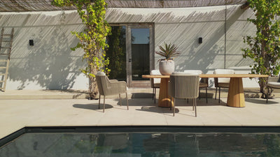 Tuinset Bernini Terre brengt tijdloze elegantie naar je terras. De zachte ronde vormen en de warme terre-tint geven de set een rustige, stijlvolle uitstraling. De handgeweven rope zittingen sluiten mooi aan op het organische ontwerp en bieden bovendien verrassend veel comfort. De royale kussens, uitgevoerd in een rijke bouclé outdoorstof, maken het geheel helemaal af. Ze nodigen uit om lang te blijven zitten of je nu uitgebreid dineert of natafelt.